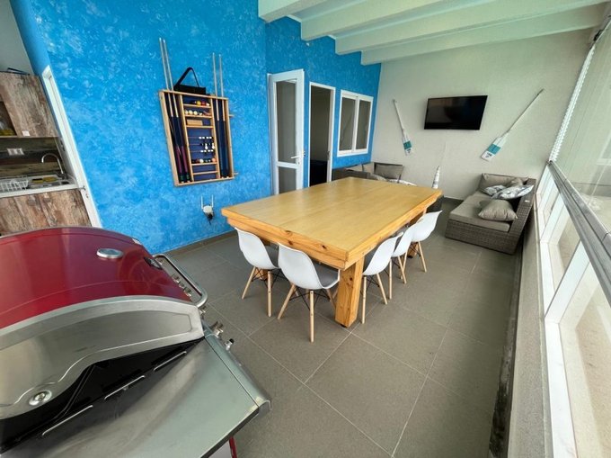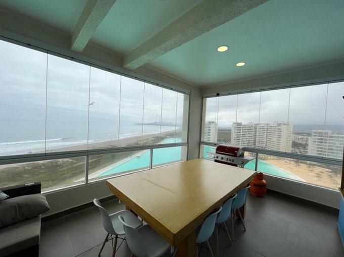 GRAN VISTA al mar y laguna, muy bien equipado, cuenta con cuatro dormitorios, tres baños, logia con lavadora, secadora, un gran estar en segundo piso, que incluye mesa de Pool y copero. terraza cerrada con cortinas de cristal plegables, ideal para mantener la espectacular vista.