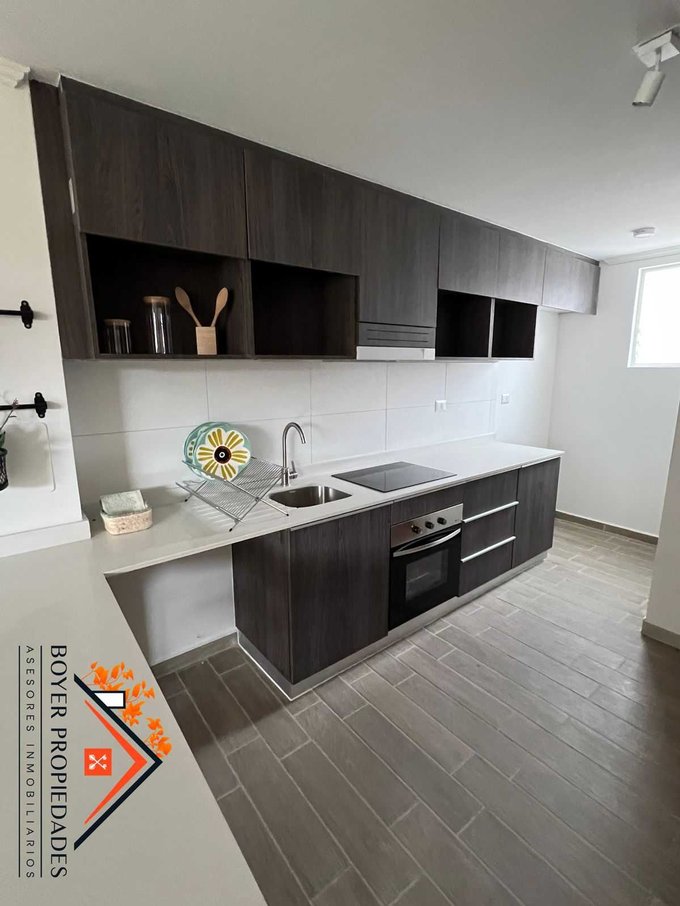 - Cocina americana completamente amoblada, cubierta de granito con encimera vitrocerámica, horno eléctrico y campana.