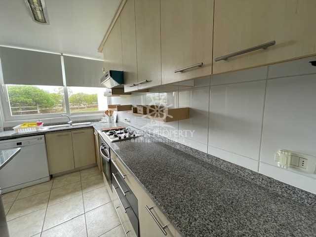 Cocina amplia y luminosa, con cubierta de granito, campana, horno eléctrico y encimera.
