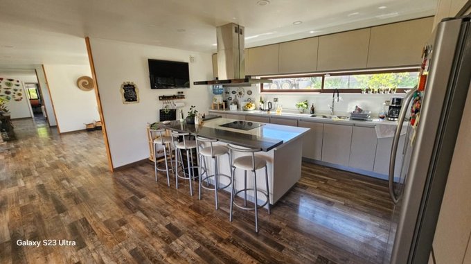 Cocina amplia con isla central, completamente amoblada y equipada