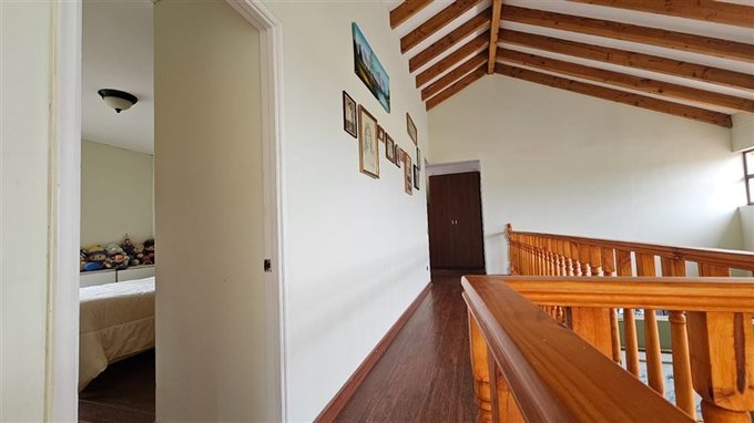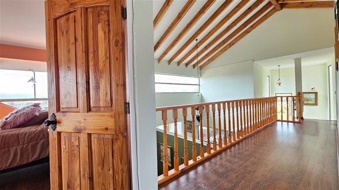 Hermosos corredor con barandas de madera y vista al area de living comedor