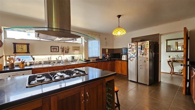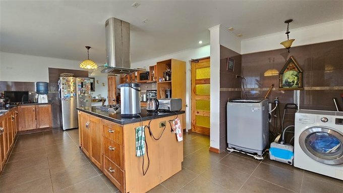 Amplia cocina con piso de porcelanato, isla con encimera a gas y loggia