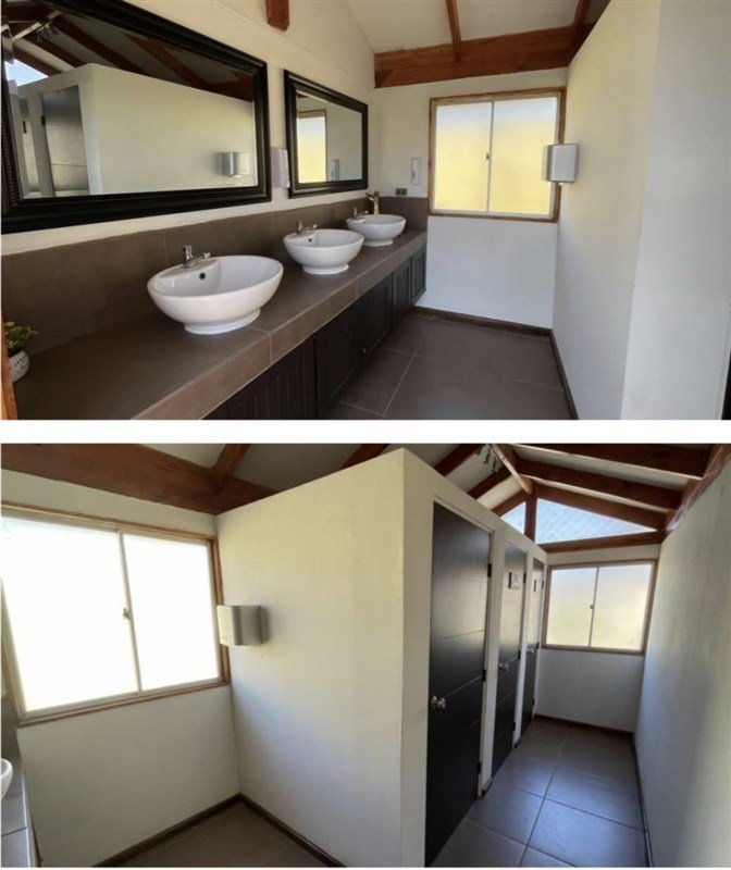 Cuenta con agua potable y sistema de tratamiento de aguas servidas con reutilización de aguas de baños y cocina para riego.