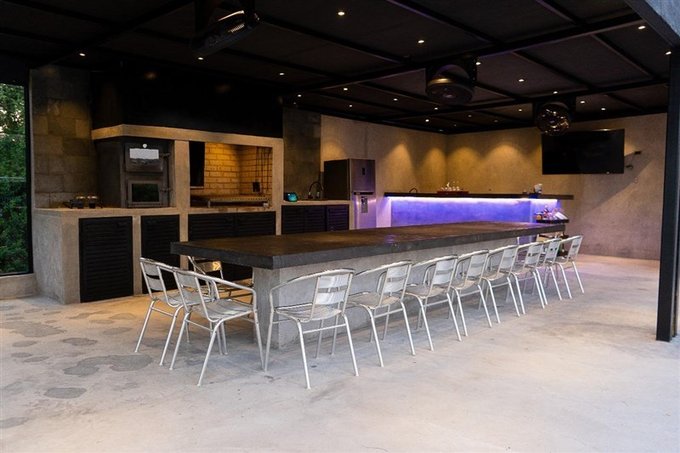 Amplio quincho, piso radier, totalmente techado vigas a la vista y pilares de fierro elegantemente pintados en negro opaco, isla de concreto cubierta de mármol y taburetes, bar , ventiladores, parrilla estilo Argentina con fogón incorporado, baño, camarín y ducha exterior.