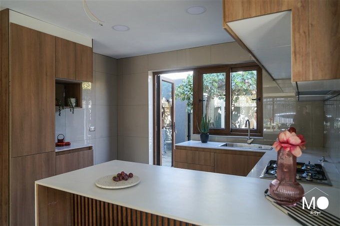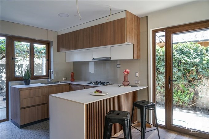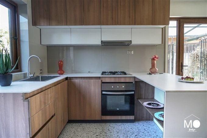 Cocina integrada con horno y encimera empotrados, con espacio para refrigerador side by side