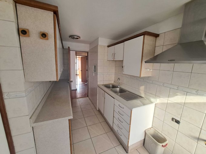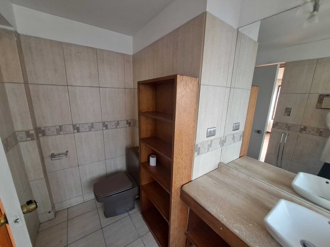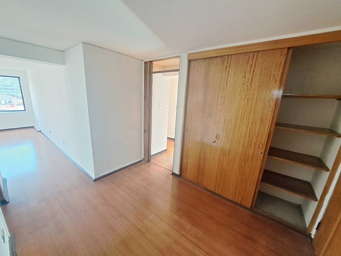 Hall entrada, closet; pieza de servicio con closet y baño ciego con ducha (tal vez para instalar lavadora); cocina amoblada, logia pequeña con calefont y shaff de basura; gran living-comedor (sin terraza); 3 dormitorios con closet; 2 baños completos (uno en suite con luz natural)