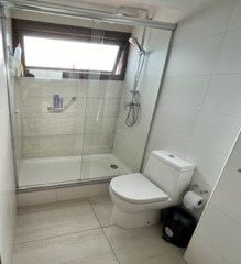 Muros de baños y cocinas revestidos en cerámica. Plato de ducha en baño principal con mampara de cristal, muebles con