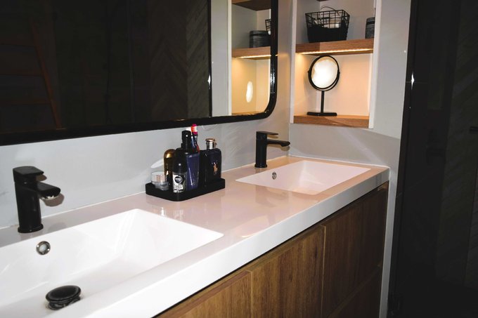 Pisos de madera en todo el departamento y porcelanato en cocina, baños y terraza, ventanas de termopanel, baños y cocina con cubiertas de cuarzo, calefacción por losa radiante, amplios closets en dormitorios y pasillos.