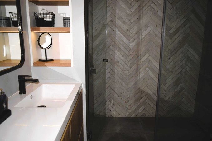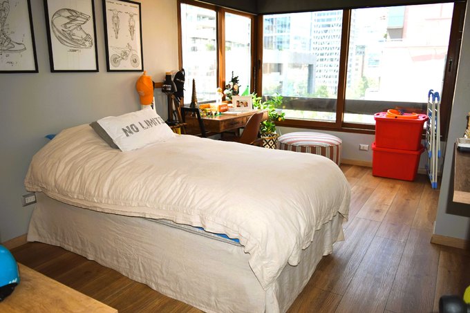 Pisos de madera en todo el departamento y porcelanato en cocina, baños y terraza, ventanas de termopanel, baños y cocina con cubiertas de cuarzo, calefacción por losa radiante, amplios closets en dormitorios y pasillos.