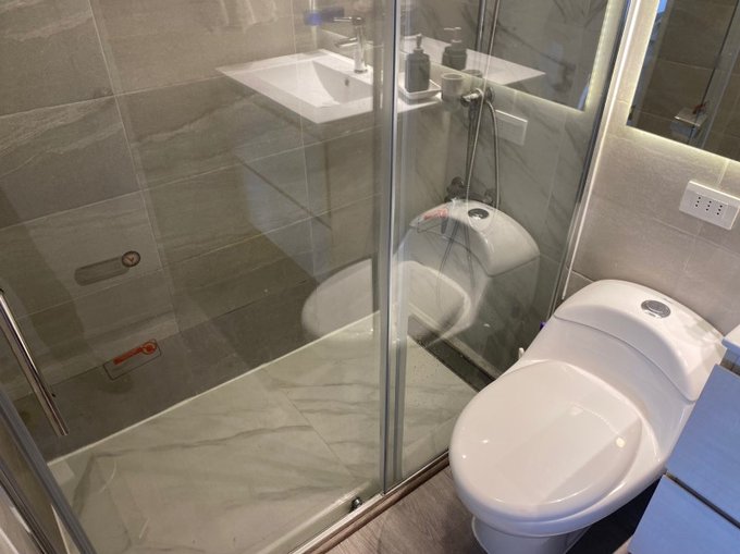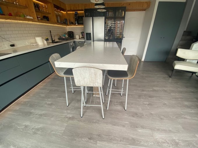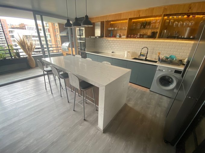 Cocina amoblada y equipada con mesón cubierta de cuarzo, encimera eléctrica, campana, horno, microondas refrigerador dos cuerpos, y muebles varios