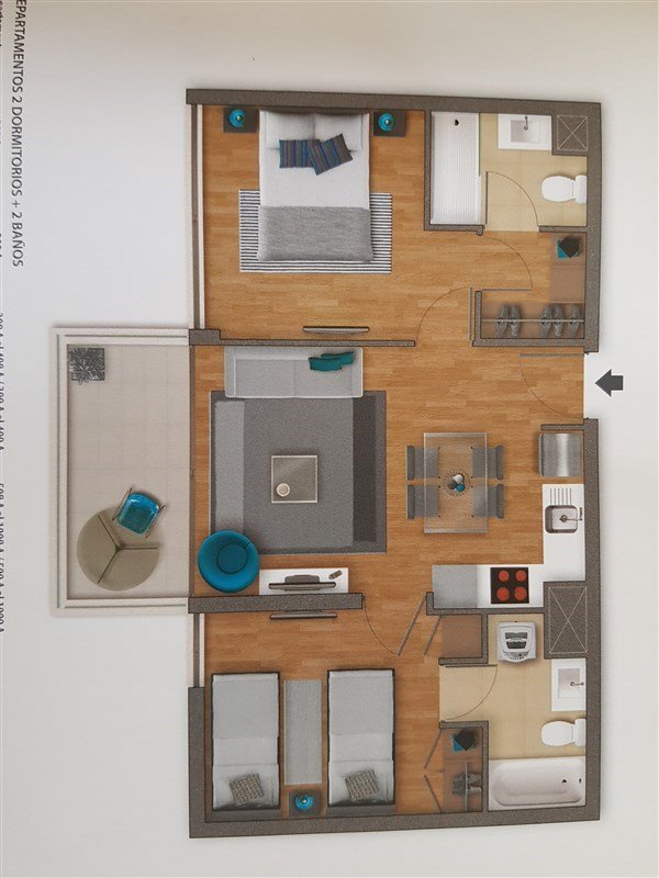 DISTRIBUCIÓN: cocina abierta con isla para asientos, living con terraza orientada al Norte, 2 dormitorios en suite (tipo mariposa) 2 baños completos (1 con instalación para lavadora de ropa). Completo edificio equipado con Gimnasio, gran sala gourmet, y Roof con piscina panorámica y quincho.