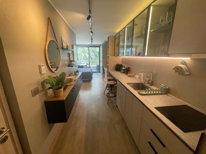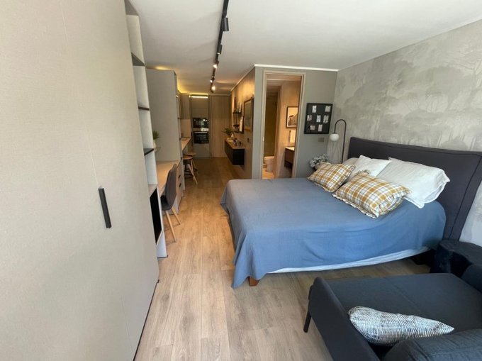 El concepto homestudio es un solo ambiente que combina cocina equipada completa con mesa para desayuno y conexión a lavadora, escritorio, dormitorio, baño con vanitorio - ducha y una terraza.