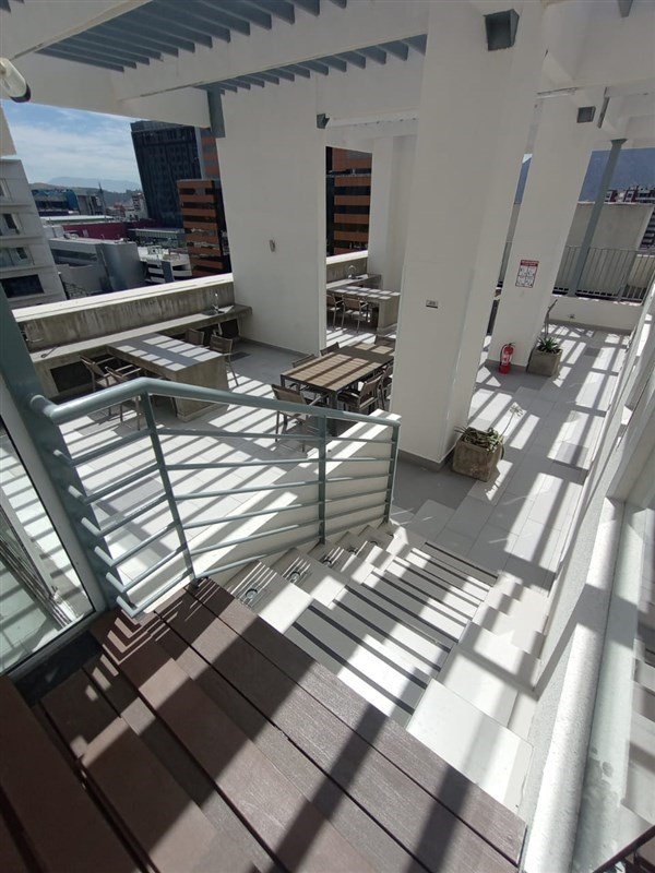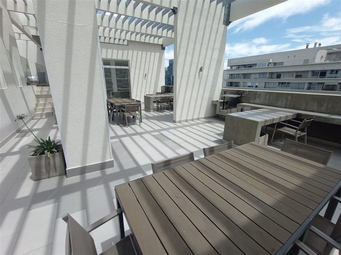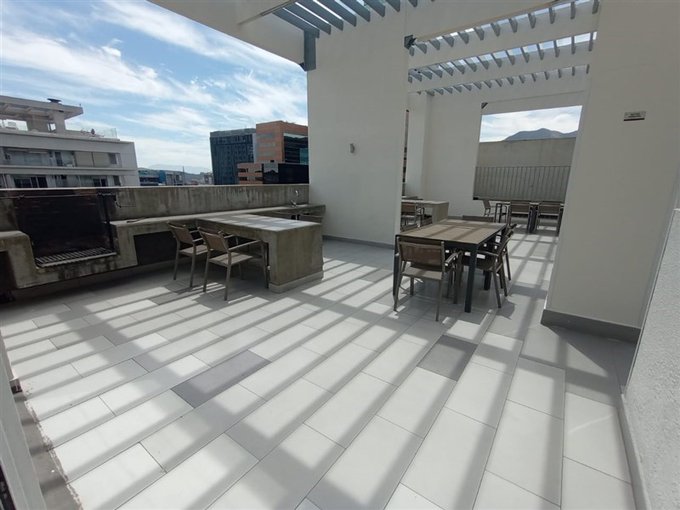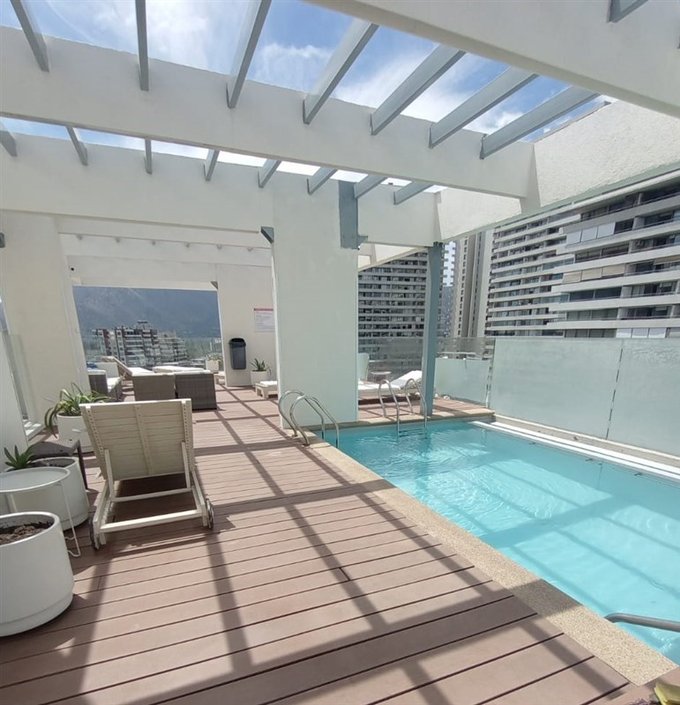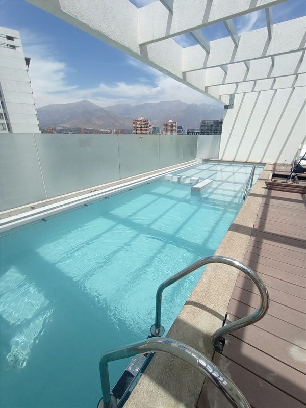 Área de uso común en techo del edificio con piscina, dos quinchos y comedor