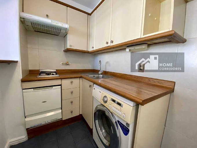Cocina americana equipada con encimera a gas, campana, lavadora y lavavajillas