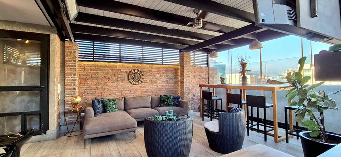 Gran terraza acondicionada para disfrutar en toda época del año: cierre con cristales y cielo impermeable; barra de bar y muros de ladrillos con iluminación integrada. Al exterior se encuentra una parrilla a gas y un hot tub en obra con estructurta que acomoda 2 reposeras. La vista es bastante privada y espectacular!