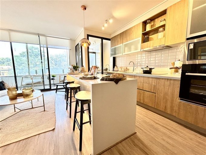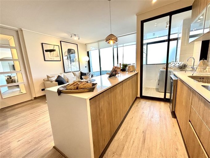 Cocina Semi integrada muy moderna, concepto tendencia con gran cubierta en cuarzo blanco, conecta con living comedor y Loggia.