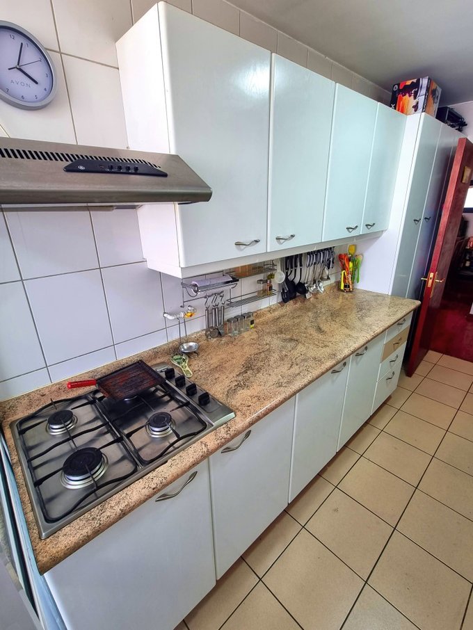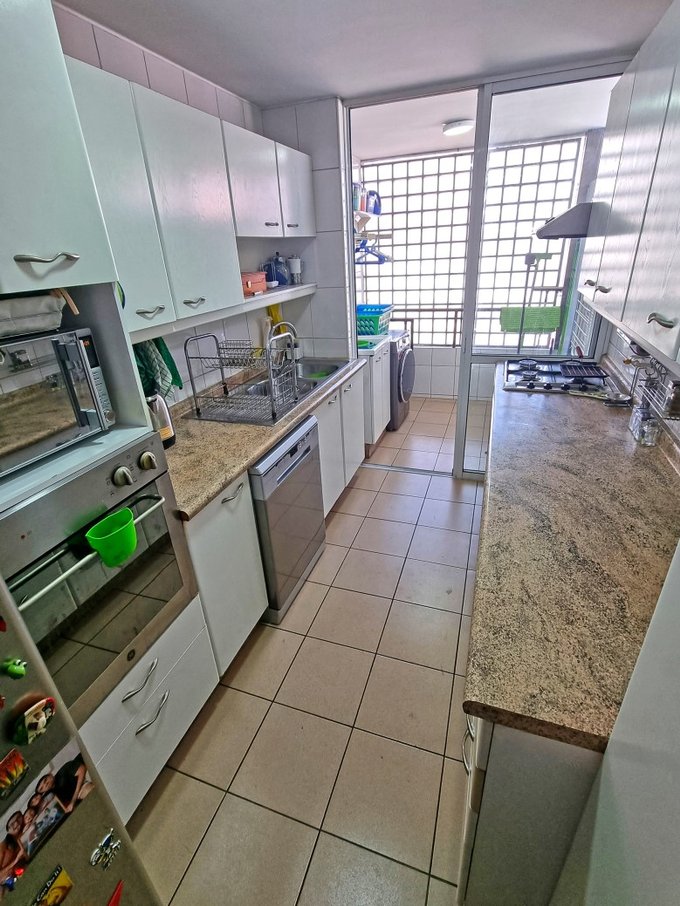 - Cocina cerrada, con mobiliario a ambos lados, cocina encimera a gas, espacio para refrigerador side by side con cañería de agua para hielo, espacio para lavavajillas, horno empotrado y salida a logia con espacio para lavadora y secadora