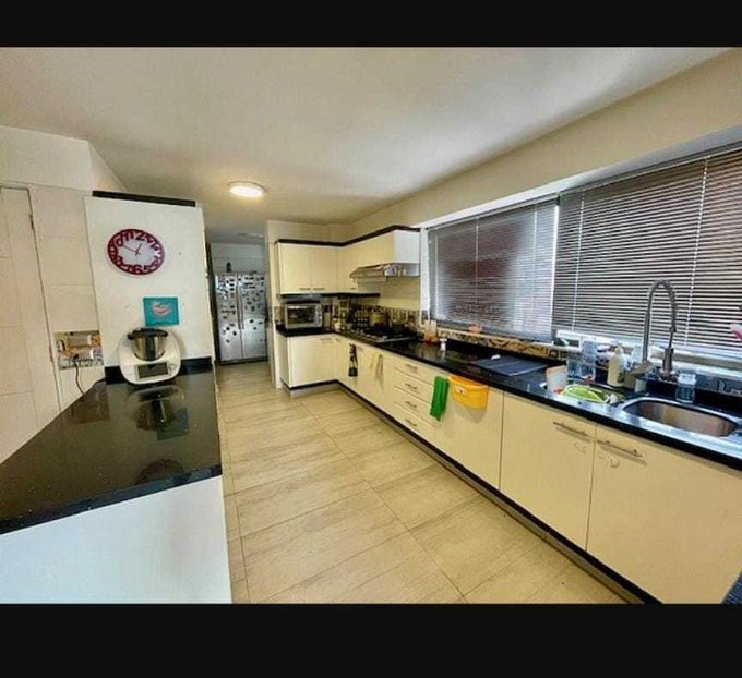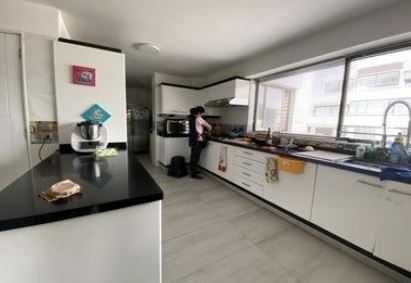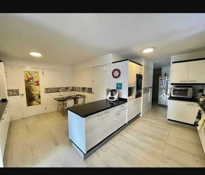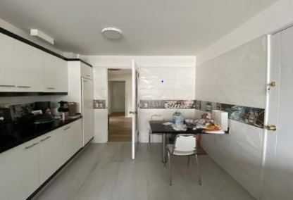 Cocina grande con comedor de diario, grandes mesones y ventanales