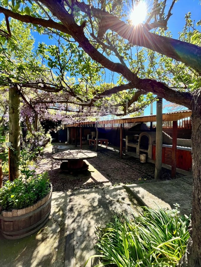 Quincho exterior techado, con baño. Fogón techado con extractor de metal, parrilla, horno a leña, mesones. Parrón cubierto con Flor de la pluma y jazmines.
