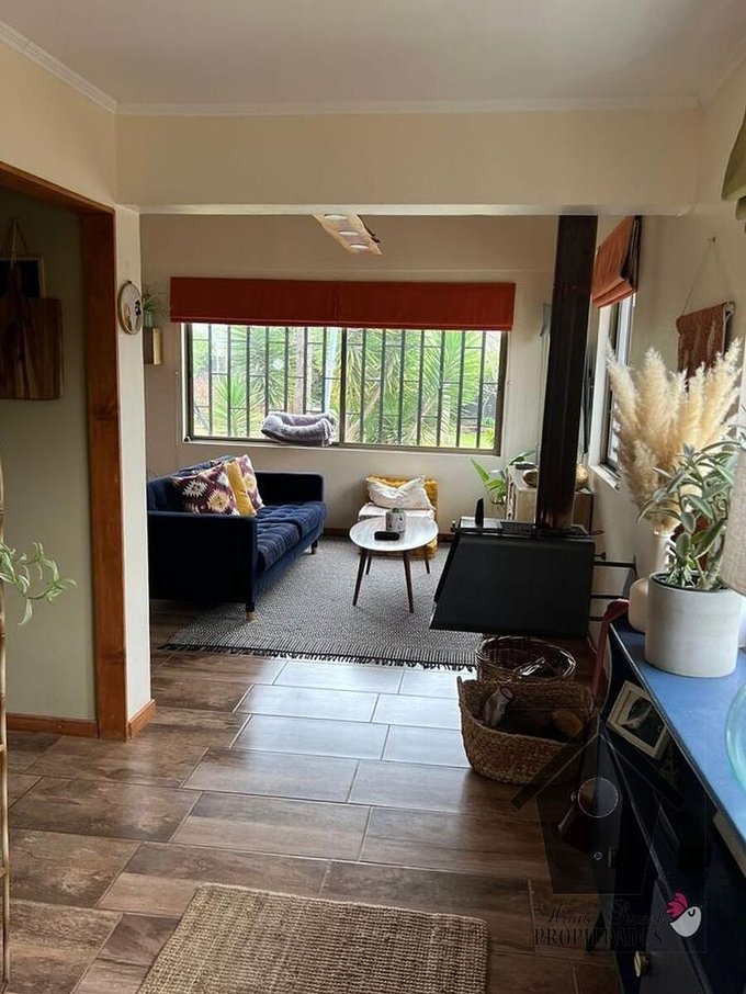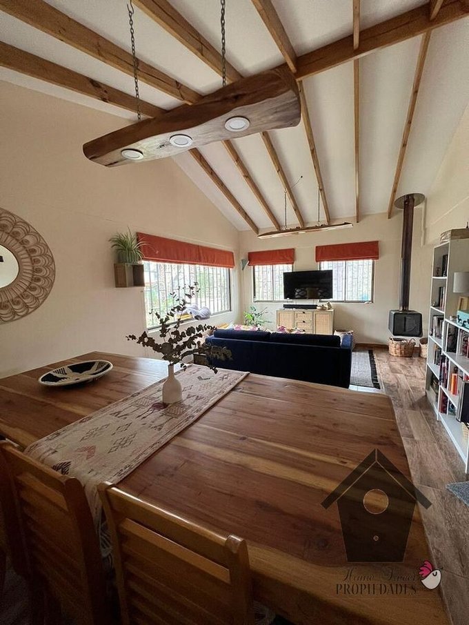 Exterior: Junto a un amplio jardín formado de 2.000 m la casa tiene el siguientes detalle de espacios e instalaciones para compartir: Terraza, quincho techado con baño, fogón techado, 3 tinas de baño para agua caliente y fría, pérgola cubierta con Flor de la pluma y jazmines, una piscina de 6x3m. Además cuenta con amplio estacionamiento, el que incluye espacio techado para dos autos y una huerta de 3,000 m