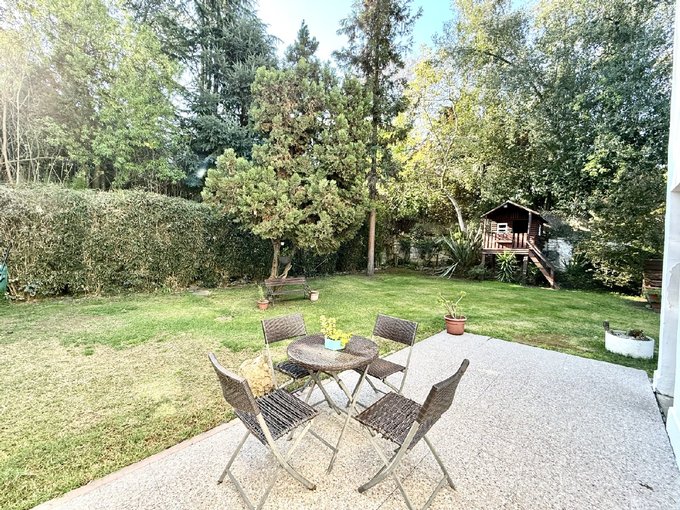 Exterior soñado: jardín maduro con pinos, frutales y araucarias ,