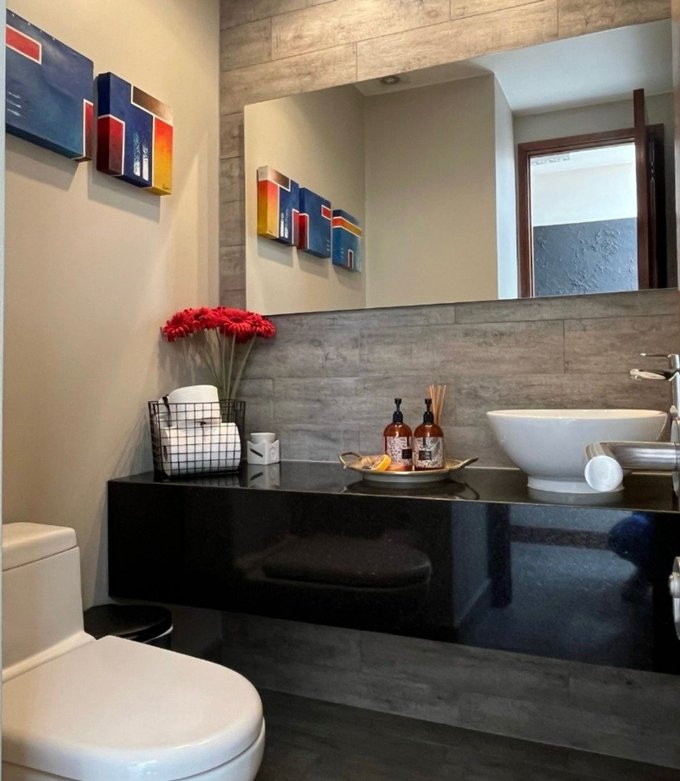Baño de visitas (social), con vanitorio de diseño moderno y detalles decorativos de alto estándar.