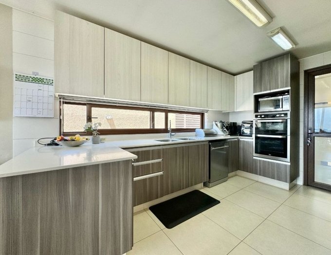 Gran cocina con comedor de diario, equipada con muebles de almacenamiento modernos y de excelente calidad.