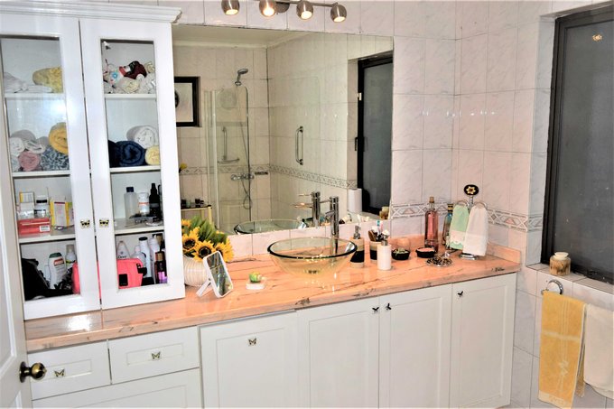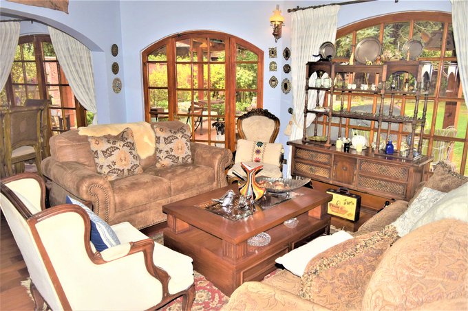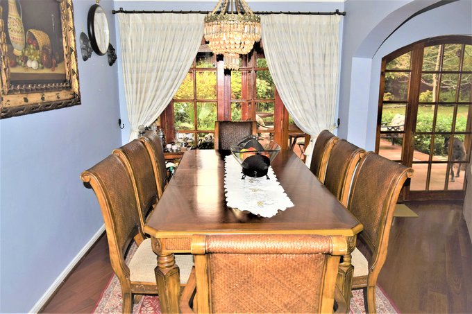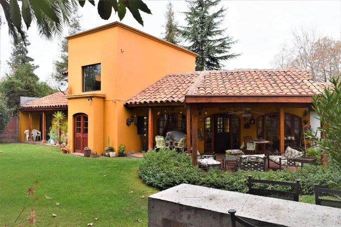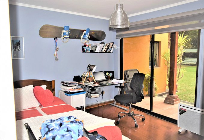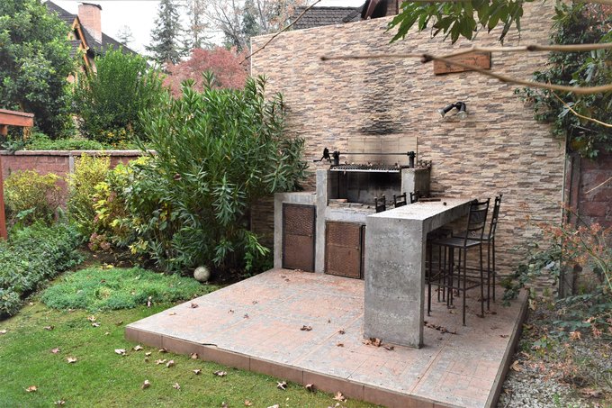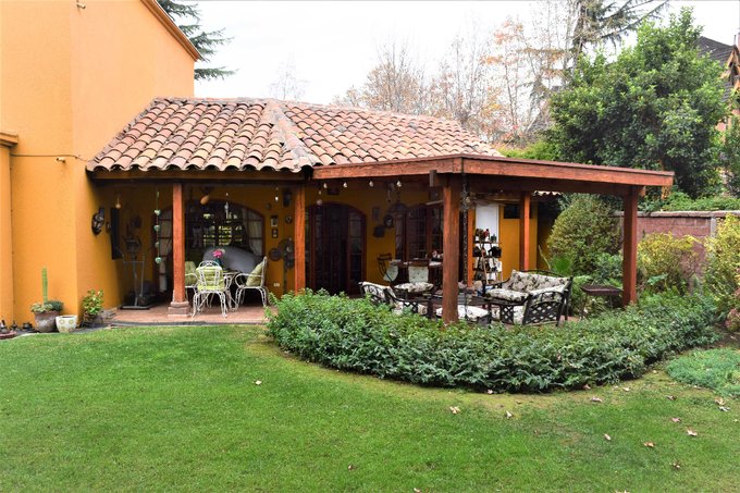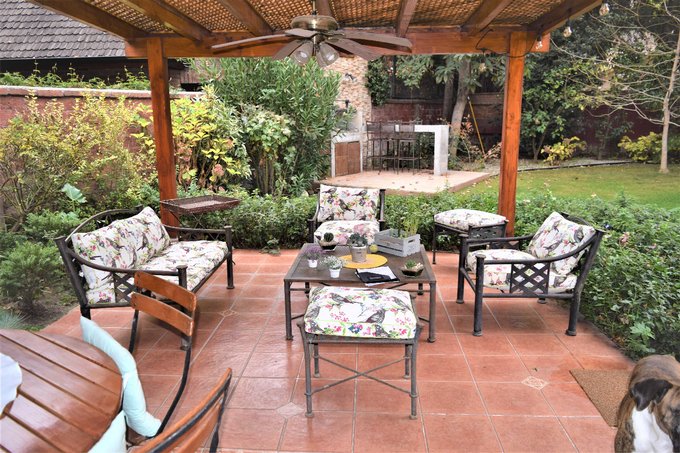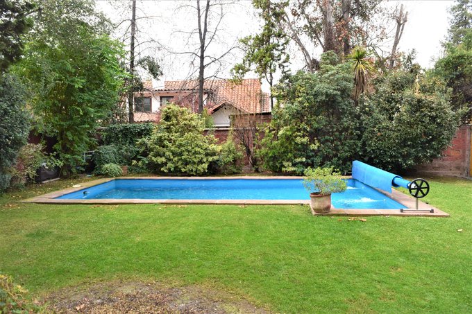 Patio interior con jardín formado, piscina con bomba de calor, quincho, terraza techada de 20 m2 aproximados; antejardín con estacionamientos para tres autos.