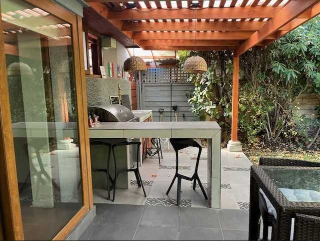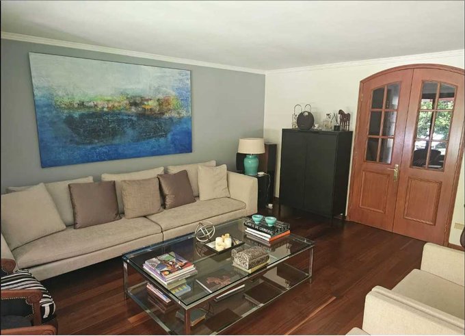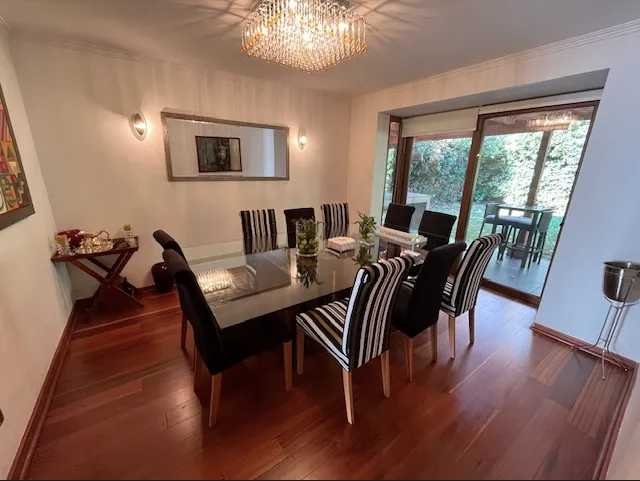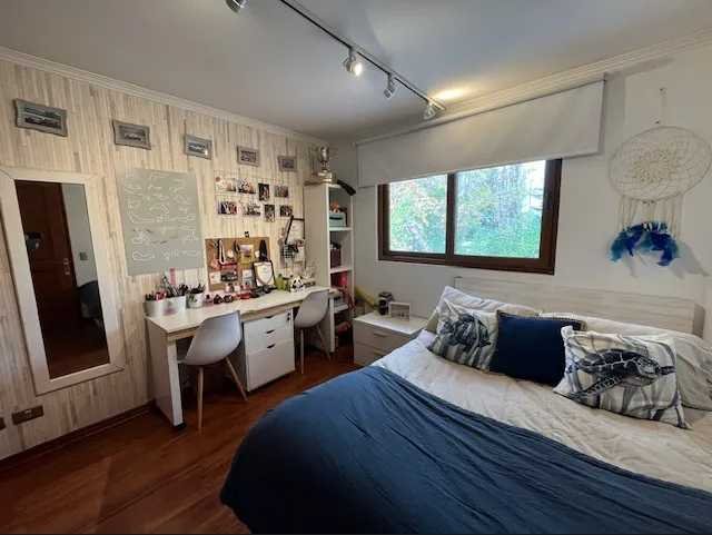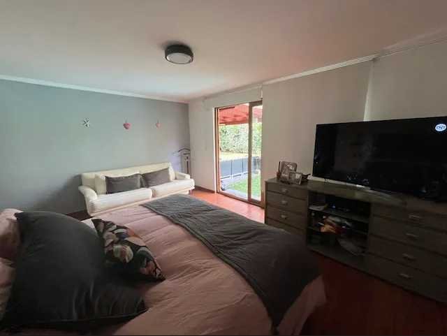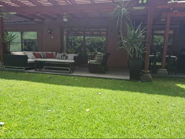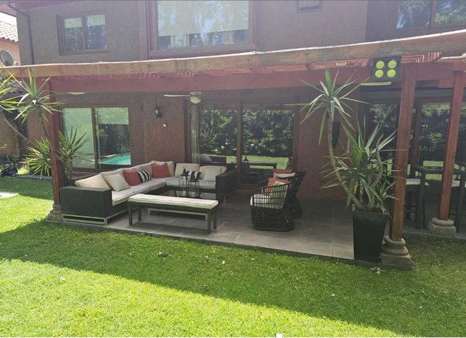 En el exterior, la casa ofrece un gran jardín con áreas verdes y piscina, ideales para el descanso y la vida al aire libre. Dispone de una terraza techada y un quincho, pensados para reuniones y actividades recreativas, complementados con mobiliario exterior y terminaciones en madera. La propiedad incorpora dos bodegas, que permiten un óptimo almacenamiento.