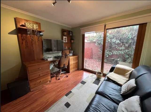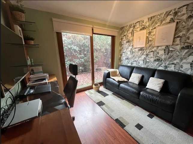 El diseño interior contempla ambientes diferenciados para sala de estar, escritorio y dormitorios, todos con ventanas hacia el exterior y terminaciones en madera. Los baños están completamente equipados, incluyendo lavamanos dobles y detalles en cerámica. La cocina se integra de forma natural a los espacios comunes mediante acceso directo al jardín, reforzando la conexión entre interior y exterior.