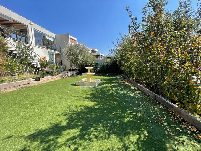 El patio, además cuenta con árboles frutales, pasto sintético (ahorro de agua), riego automático programable y una linda fuente de agua de 3 niveles en el centro.