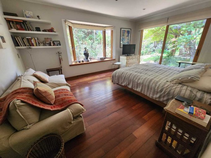 Dormitorio principal en suite con walk-in closet y salida al jardín.