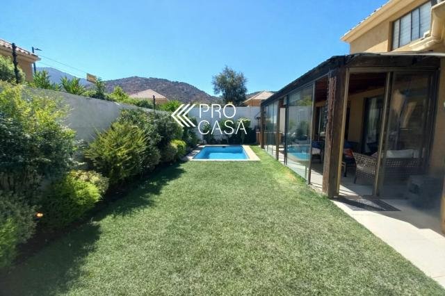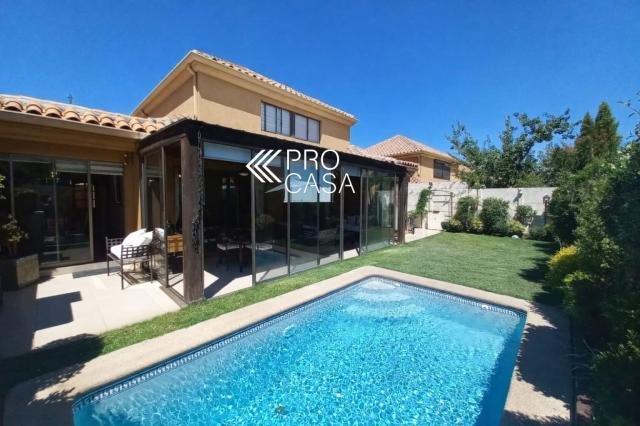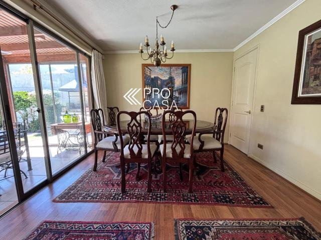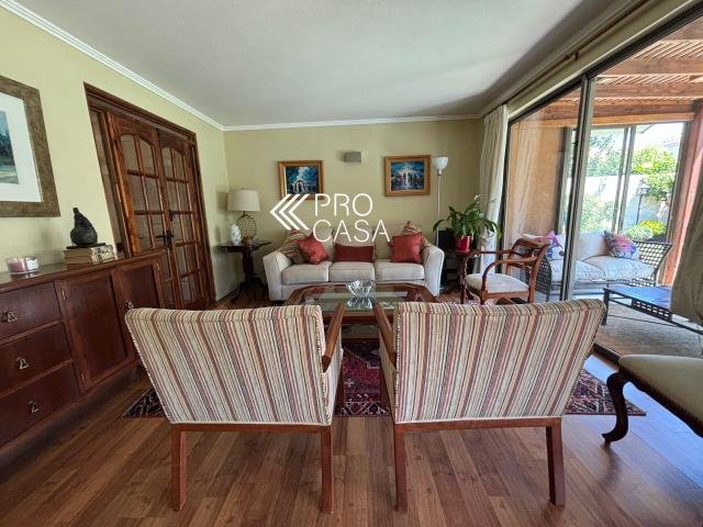 Código interno Procasa: 68962 Ubicación privilegiada en calle muy tranquila, frente a plaza. A pasos del Colegio Huinganal Primer piso: Hall de entrada, living/comedor con salida a amplia terraza, cocina con gran comedor de diario, baño de visitas, dormitorio y baño de servicio. Dormitorio principal en suite y un escritorio, que puede ser un cuarto dormitorio. Segundo piso: Gran sala de estar y dos dormitorios que comparten un baño. Terraza techada, quincho, jardín formado con piscina. 166 m2 útiles en 312 m2 totales (Metraje entregado por propietario, sujeto a verificación) Contribuciones: $495.000 aprox.