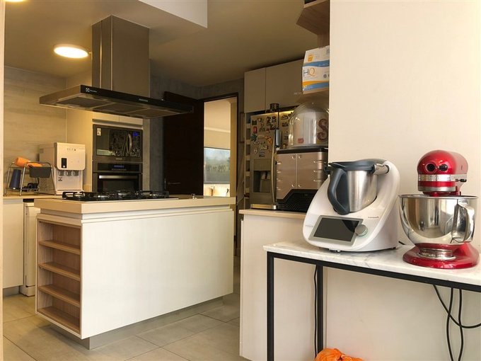 Cocina cerrada full equipada con isla, cubierta de cuarzo, horno empotrado y campana de acero