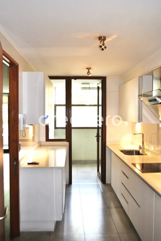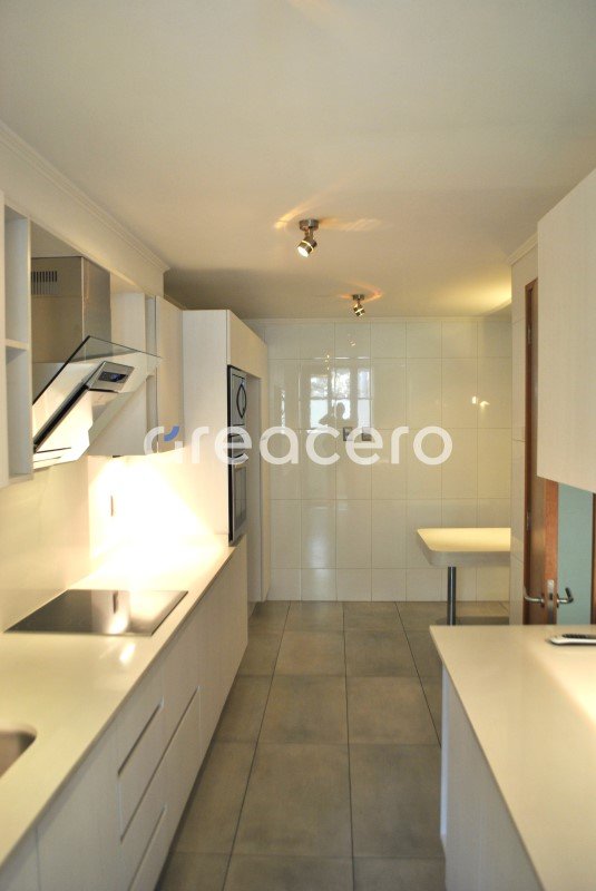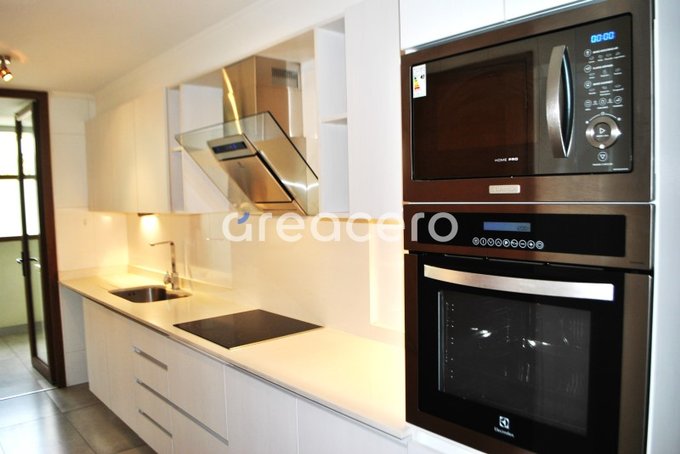 - cocina equipada con horno, microondas empotrado, campana y encimera, comedor de diario