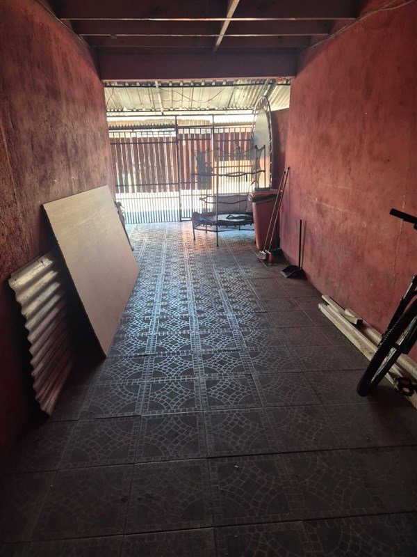 Patio con pasillo lateral techado, vigas a la vista