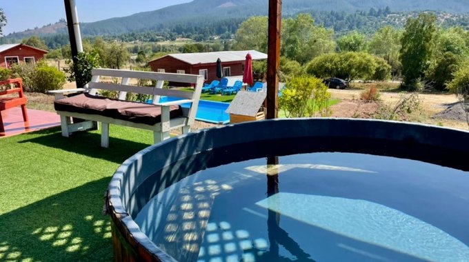 Casa principal con 110m2 construidos, cocina, living y comedor, 2 amplios dormitorios, 1 baño completo con conexion a lavadora, terraza, 1 tinaja para 12 personas, 1 Sauna.