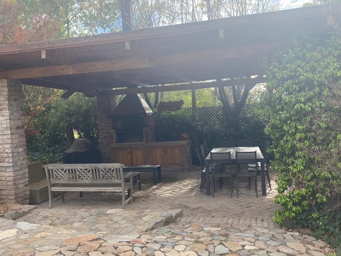 Portón de ingreso automático, patio delantero con precioso jardin . Bodegas de almacenaje como para leña o guardar bicicletas o herramientas.