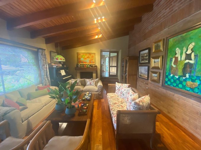 Living separado con puerta y en desnivel con comedor,chimenea y ventanales con salida a terraza, vigas a la vista y muros de ladrillo .