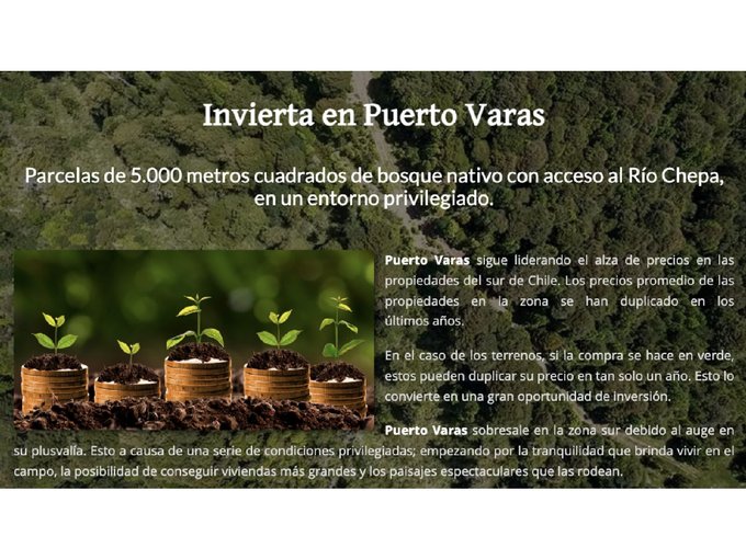 CONDICIONES COMERCIALES Terrenos de 5.000 m2 de bosque nativo con acceso al Río Chepa, en un entorno privilegiado, con una ubicación inmejorable, prometen ser la mejor inversión para tu futuro. Invierte en una ubicación estratégica de alta plusvalía
