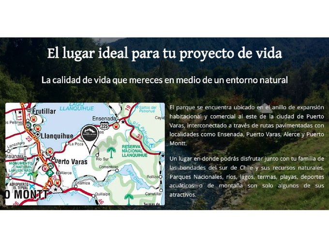 Vecino a la Reserva Nacional Llanquíhue, la que tiene una extensión de 33.972 hectáreas, el proyecto consiste en una parcelación de 126 lotes de 5.000 metros cuadrados, cada uno con Rol Propio Individual y acceso comunitario al río Chepa, que bordea todo el parque.