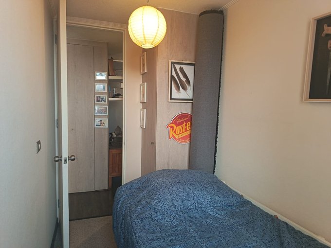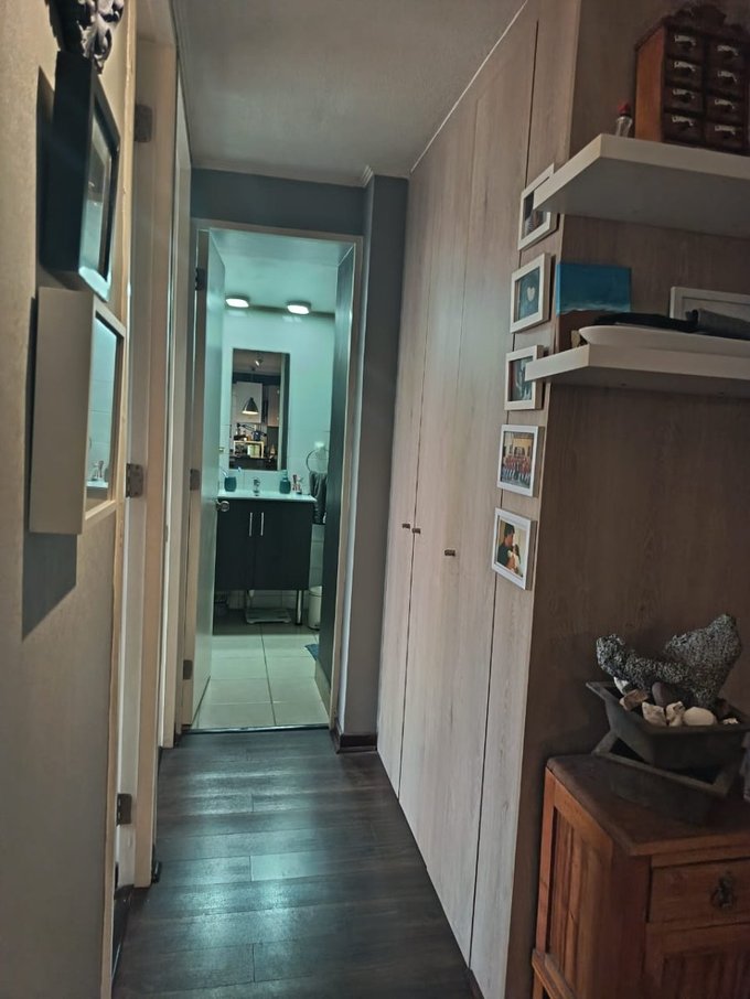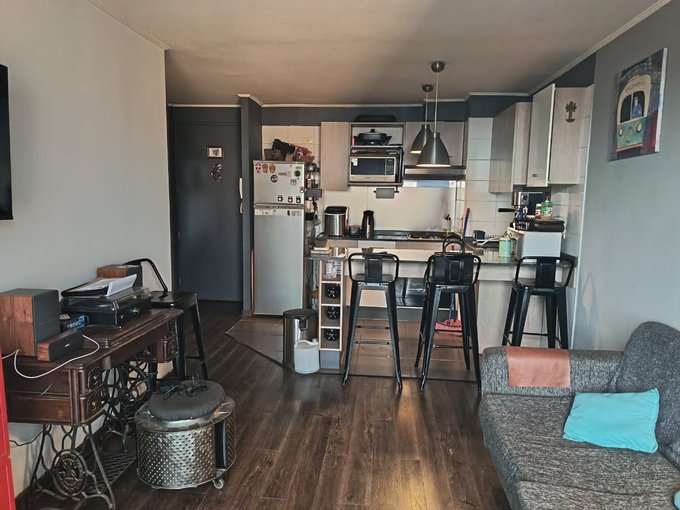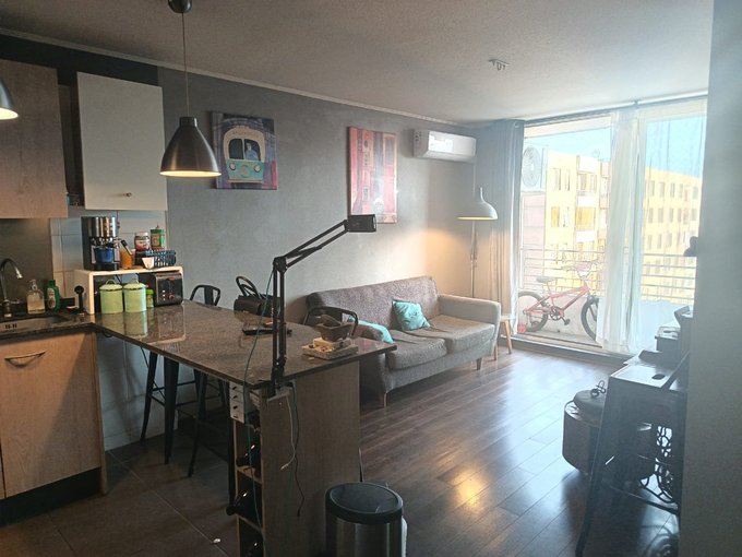 Se vende cómodo departamento de dos habitaciones, una grande dónde cabe cama de dos plazas y otra más pequeña dónde cabe una cama de plaza y media y un velador, ambas con closets, y piso de alfombra. Un amplio baño con tina e instalación para lavadora secadora. Un amplio closet para guardar en el pasillo, y atrás de la puerta de entrada, la cocina es americana y esta amoblada, con mesón de granito, y amoblada totalmente, ese espacio tiene piso de cerámica y el living comedor o sala, tiene piso flotante y salida a un balcón grandecito que cabe una silla para descansar o tomar aire y con vista sur de la ciudad, además cuenta con aire acondicionado Anwo que permite temperar todo el departamento con frío en verano o calor en invierno. El departamento cuenta con ventanas de PVC con una tecnología que aísla muy bien el ruido y la temperatura tanto calor como frio en el invierno. Se encuentra ubicado en un piso catorce y con una vista despejada totalmente. El edificio cuenta con piscina, dos salones de eventos, dos gimnasios equipados, dos quinchos, una plaza de juegos infantiles para primera edad. acceso controlado las 24 horas, con reconocimiento facial para los residentes y circuito cerrado de televisión. También el condominio cuenta con un supermercado a una cuadra, se encuentra a una cuadra también de Ñuñoa, y a cinco del Portal Ñuñoa, con excelente acceso a servicios, colegios, farmacias y muy buenos restaurantes en el sector, no te arrepentirás si lo visitas. Puede ser una excelente inversión o una muy buena opción si es primera vivienda. No dejes de visitar.