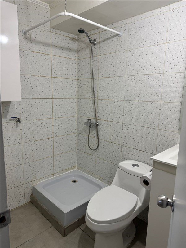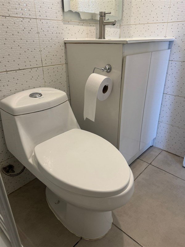 El baño está equipado con shower door, lavamanos con vanitorio, conexión para lavadora y mueble empotrado para almacenamiento de toallas y artículos de baño.