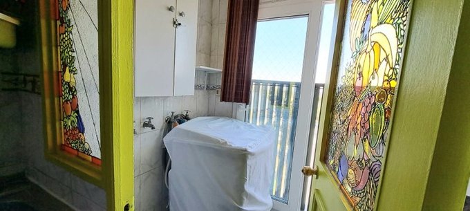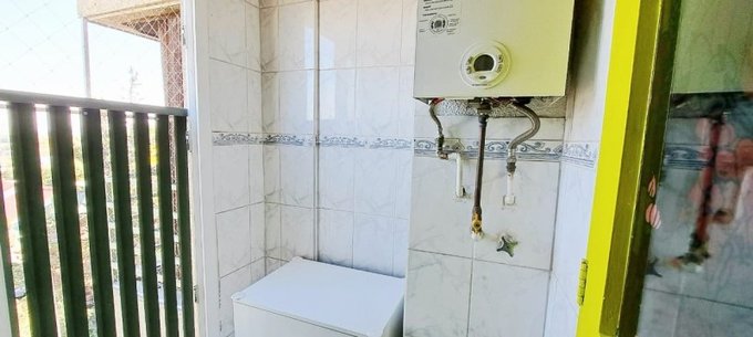 Cocina amoblada y logia con instalación a lavadora.
