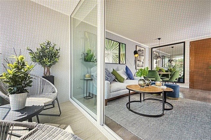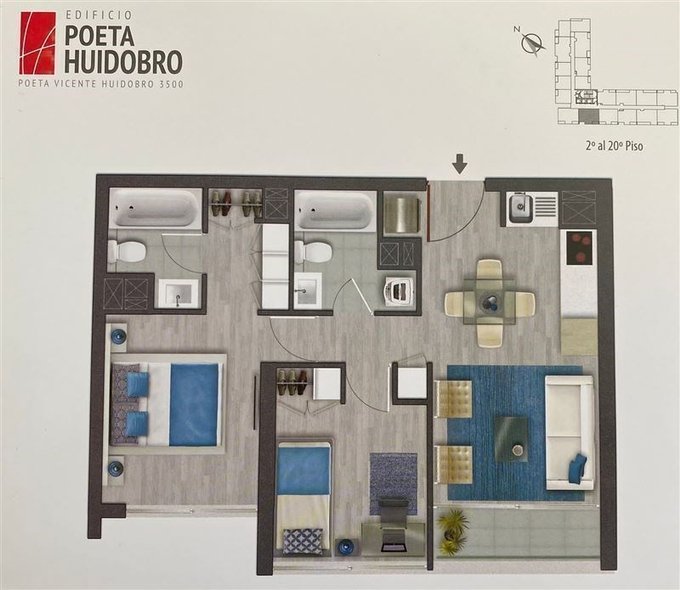 Departamento dos dormitorios, cocina incorporada, dormitorio principal con baño en suite, segundo baño completo, logia, terraza, ventanales con termopanel.