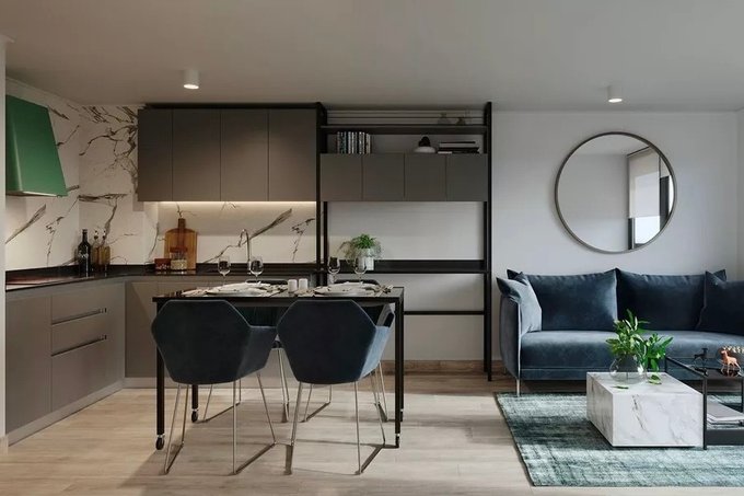 COCINA SEMI AISLADA, equipada con horno, encimera, microondas y campana marca Franke.