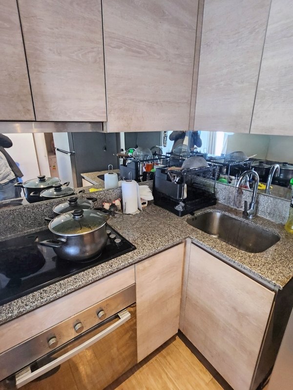 - Living y cocina americana juntos, con mesón de granito, artefactos empotrados eléctricos y espacio para refrigerador. Instalación para lavadora frente a cocina