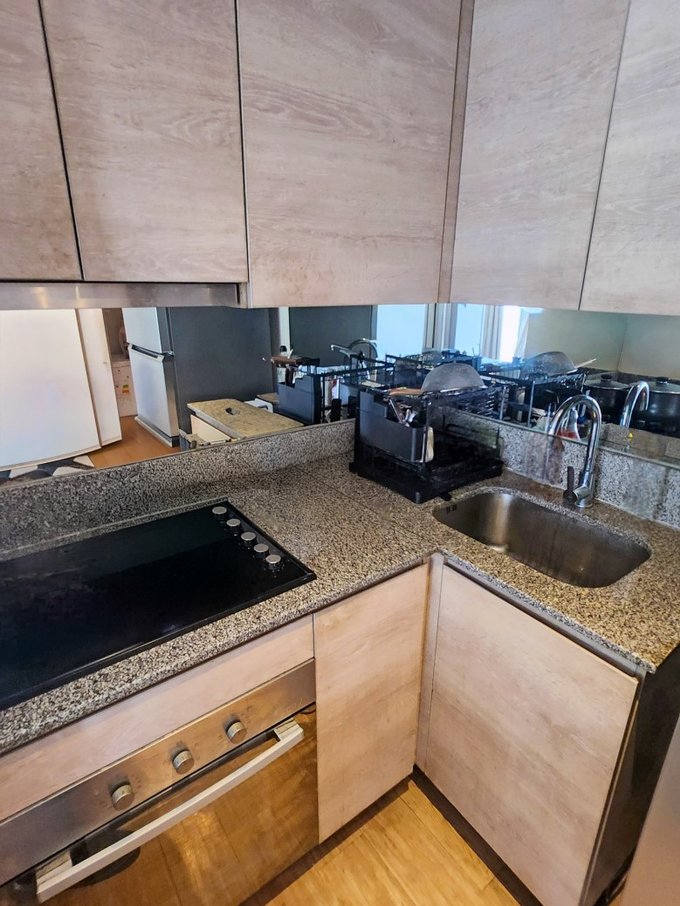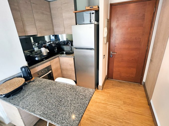 - Living y cocina americana juntos, con mesón de granito, artefactos empotrados eléctricos y espacio para refrigerador. Instalación para lavadora frente a cocina