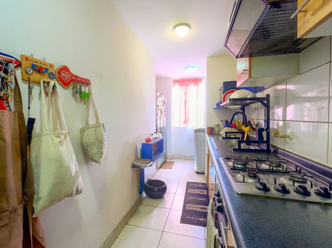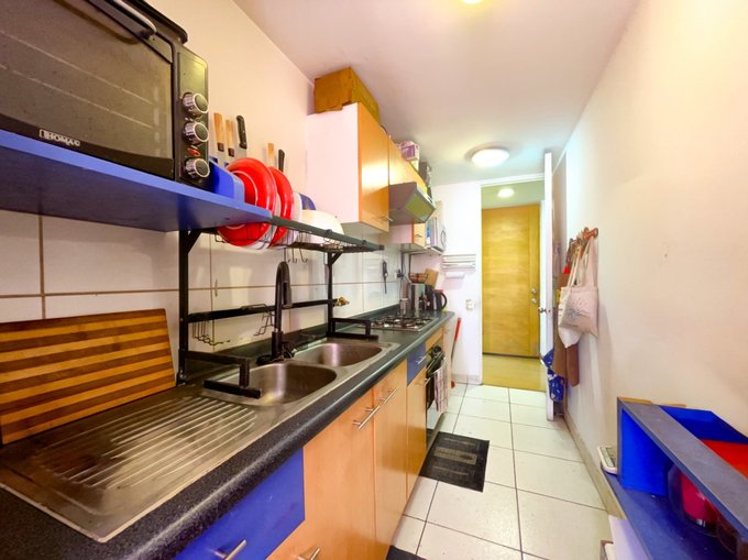 - Cocina cerrada, con artefactos empotrados, cocina a gas, lavaplatos doble y espacio originalmente pensado para desayunador o comedor de diario, actualmente utilizado para refrigerador side by side. Instalación para lavadora y calefont automático