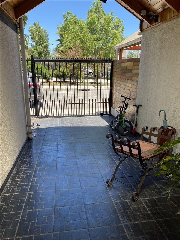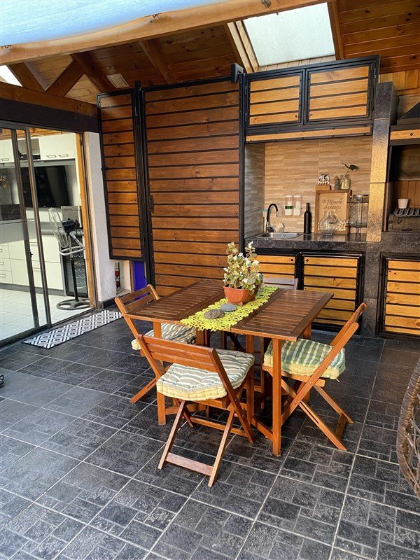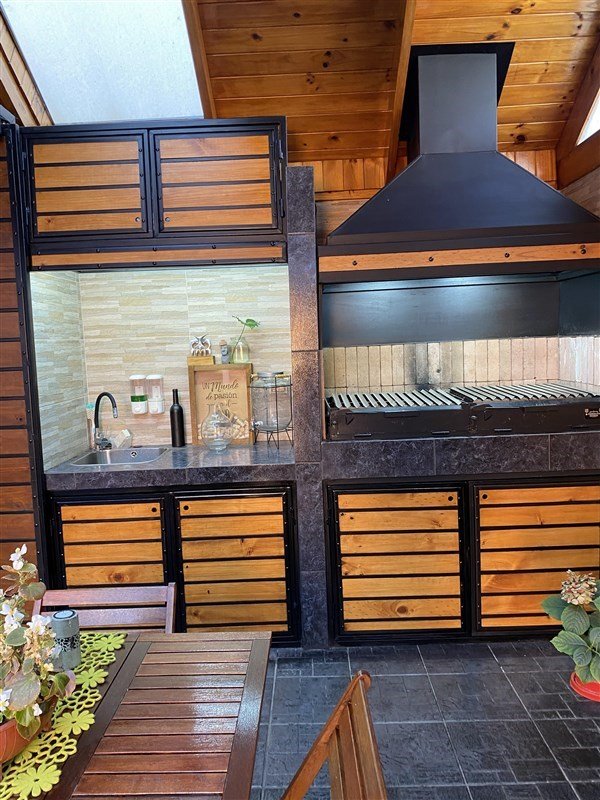 Patio trasero con quincho techado, lavaplatos y muebles para asados